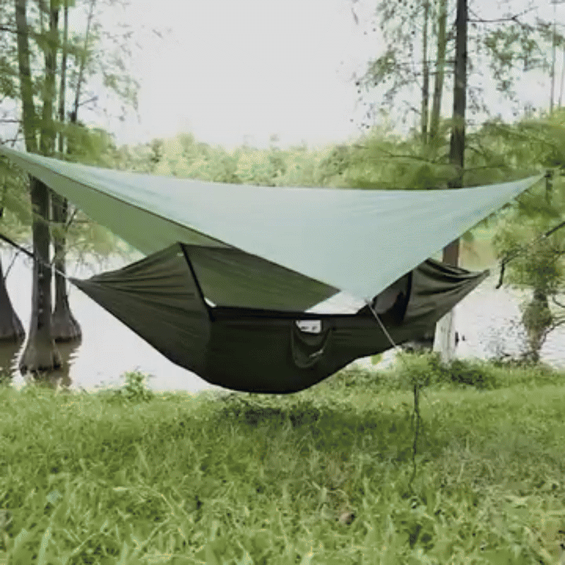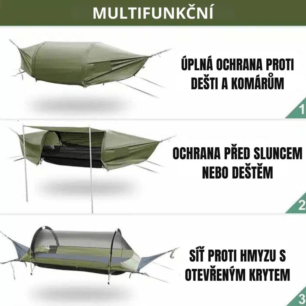 Použijte ji otevřenou pro relaxaci na slunci, s integrovanou moskytiérou proti hmyzu nebo s voděodolnou plachtou proti dešti, větru a UV záření. A když nejsou po ruce žádné stromy, změní se v připravený přístřešek na zemi.