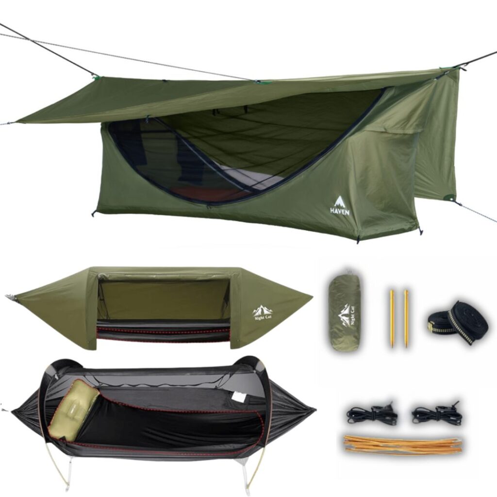 JungleSafe™ se přizpůsobí každému prostředí. Nabízí tři zavěšené konfigurace: otevřená, s moskytiérou nebo s nepromokavou plachtou. Když nejsou stromy k dispozici, promění se v stabilní a izolovaný stan na zemi. Vyrobena z 210T technického nylonu vojenské kvality s dvojitou vrstvou – odolná proti vodě, roztržení a opotřebení i v těžkých podmínkách. Bez kompromisů.