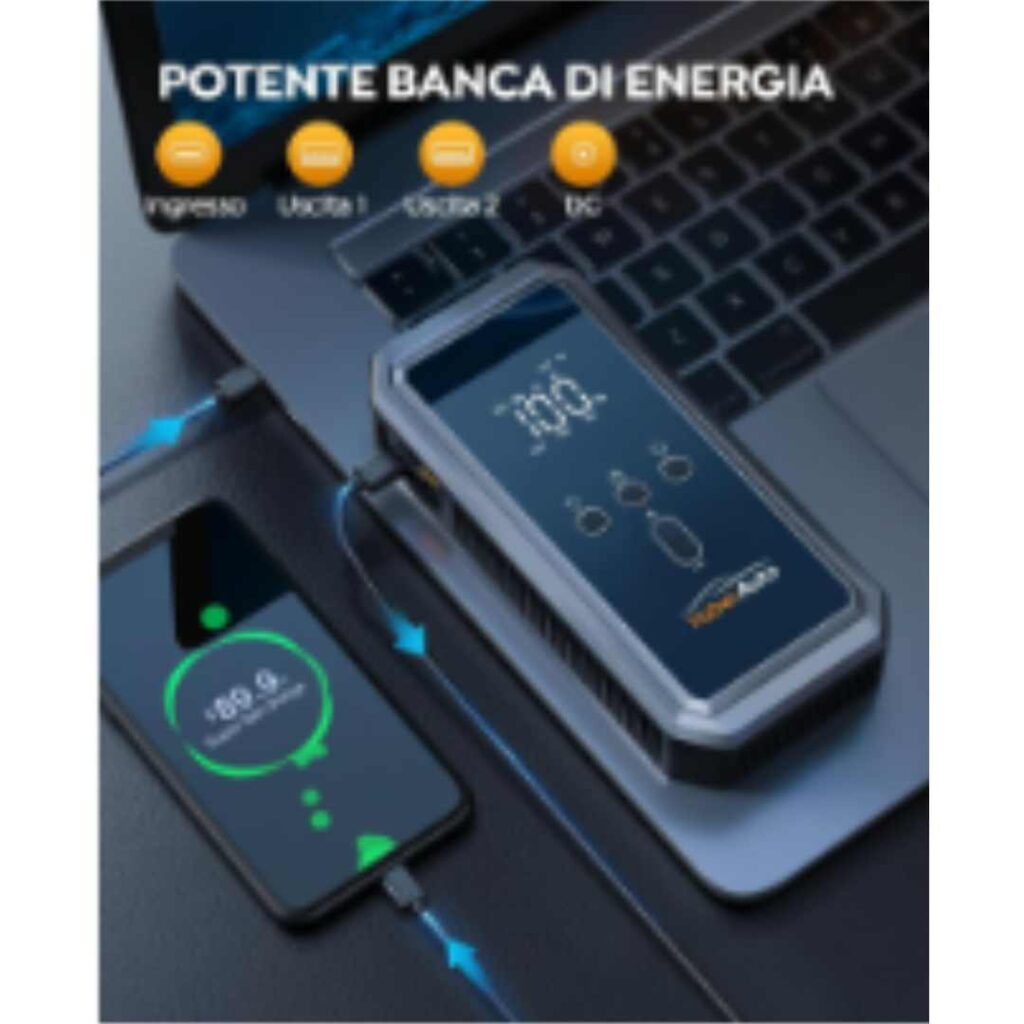 Dispone di 3 modalità di illuminazione tramite luce LED integrata: torcia, SOS e lampeggiante stroboscopica. L’avviatore di batteria YA70 non è solo una fonte di luce, ma funziona anche come power bank multifunzione.