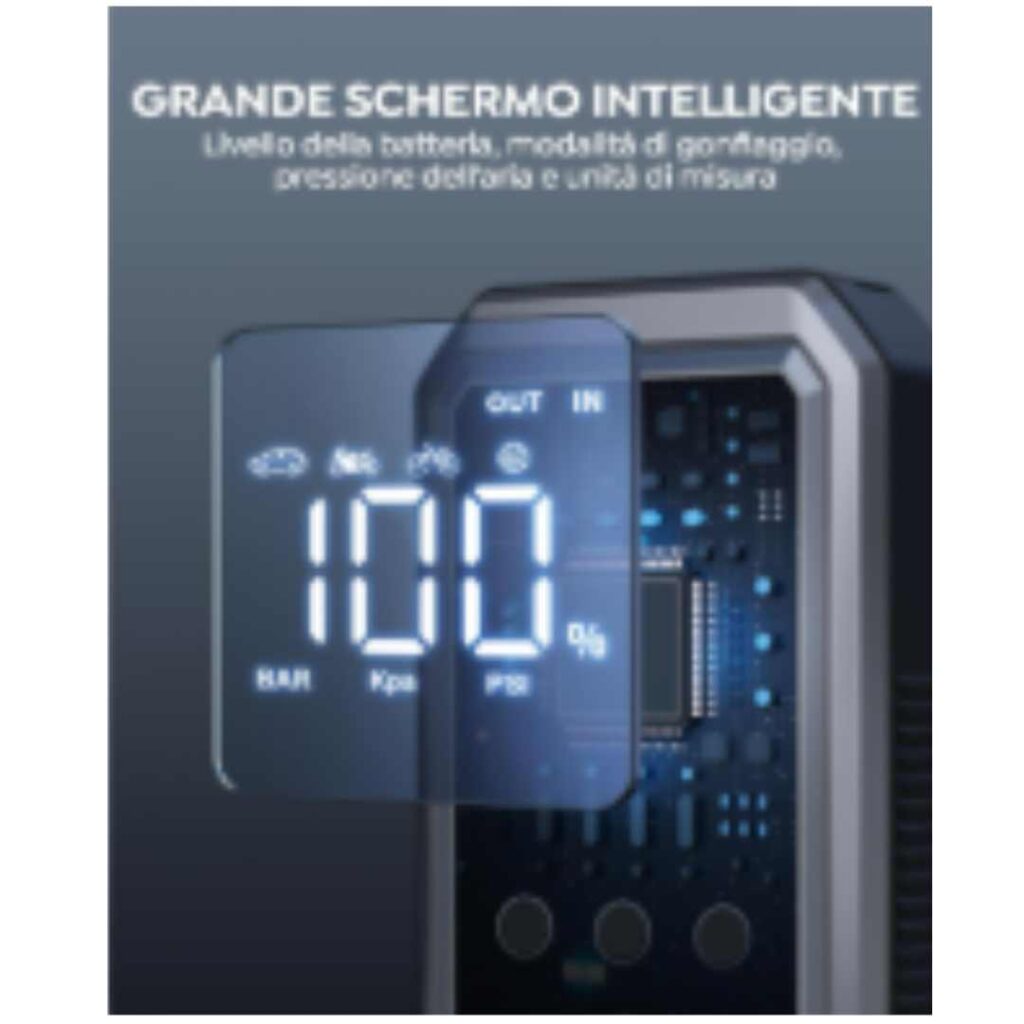 Il compressore digitale integrato eroga una pressione massima di 150 PSI ed è programmabile su 5 modalità di gonfiaggio preimpostate: pneumatici per auto, moto, bici, palloni e una modalità personalizzabile. Supporta inoltre 3 unità di misura selezionabili: BAR, KPA e PSI.
