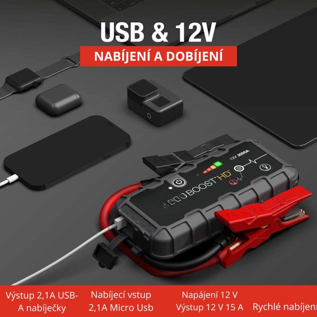 Nabíjí dvě zařízení současně, výkonná svítilna se 3 režimy osvětlení dosahující až 300 metrů, startuje dieselové a benzinové motory, reguluje tlak v pneumatikách a dokáže nafouknout i pneumatiky terénních vozidel.