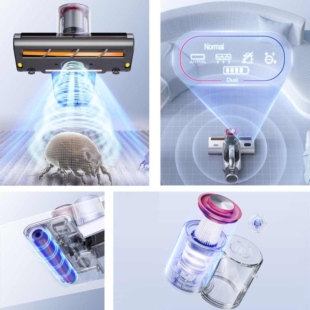 Questa tecnologia assicura una battitura ad alta frequenza, capace di eliminare acari e allergeni anche negli strati più profondi di letti, cuscini, divani e tappeti.