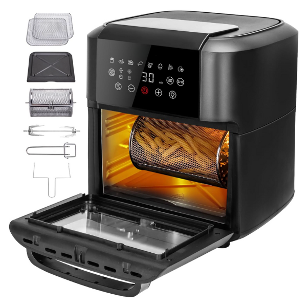 Karšto oro grilio technologija ir vidinė rotacija užtikrina vienodą, traškų ir sveiką kepimą – be aliejaus. Tinka mėsai, vištienai, bulvytėms, žuviai ar daržovėms – gardu ir be kaltės jausmo.