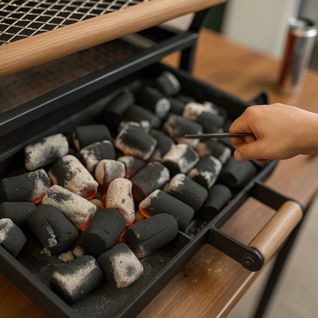 Pohyblivý zásobník na uhlí je srdcem grilu: umožňuje přesně regulovat teplotu podle způsobu přípravy. Uhlí blíže – intenzivní grilování, dál – jemné a rovnoměrné teplo.