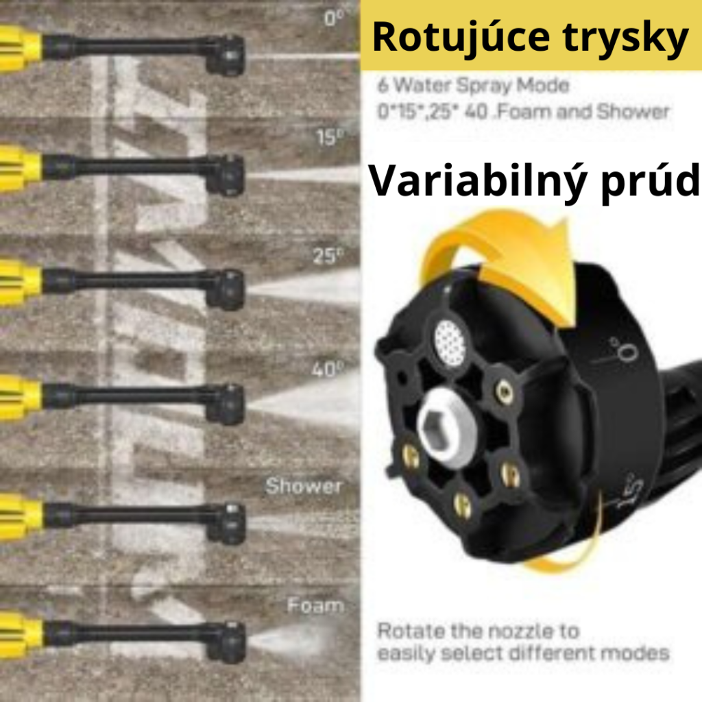 Rotačné trysky menia typ postreku v závislosti od polohy, od priameho (ideálny na drhnutie) po hmlový (ideálny na čistenie, ošetrovanie atď.).