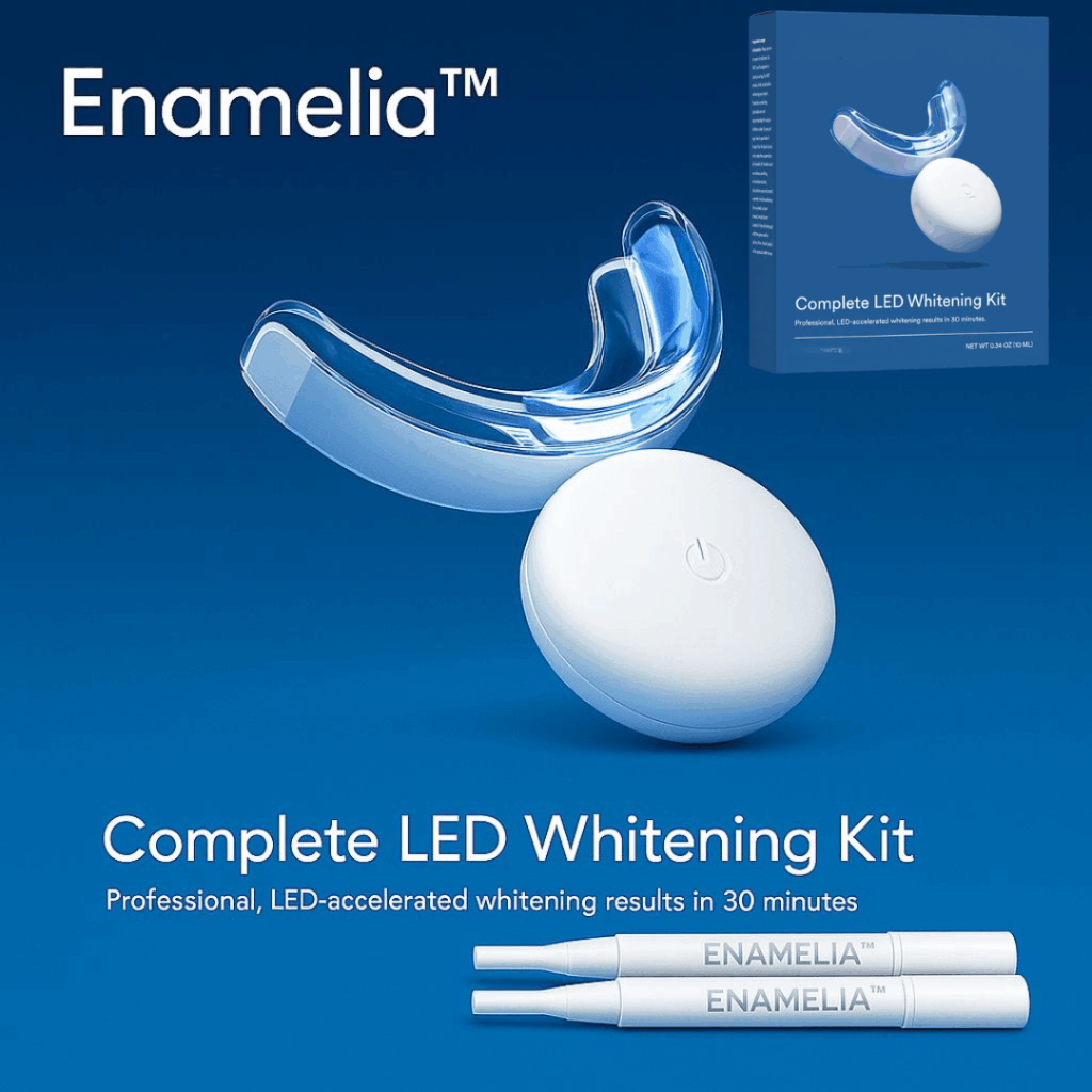 Készletünk peroxidmentes, PAP-alapú gélből és kék LED-fényből (látható, nem UV) áll, célzottan a külső elszíneződések (kávé, tea, dohányzás) ellen. A PAP szelektív oxidációval hat a fogfelszín kromoforjaira, így csökkenti a discoloratio láthatóságát a zománc agresszív terhelése nélkül. A formula pH-kiegyensúlyozott, kálium-nitrátot tartalmaz a komfort érdekében érzékeny fogaknál és íny esetén. Az eljárás gyors (10–15 perc), ismételhető, és otthon is kivitelezhető egyértelmű protokoll szerint