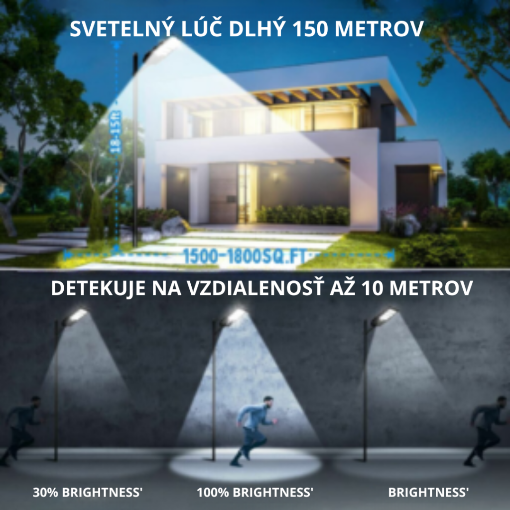 Jednoduchá inštalácia. 3 svetelné režimy LED na osvetlenie a ochranu vašej záhrady. Pohybový senzor do vzdialenosti 10 metrov. Dosah lúča 150 metrov. Má autonómiu 24 hodín s iba 3 hodinami solárneho nabíjania. Vodotesné, odolné voči vetru, dažďu a snehu. Ovládateľné cez smartfón a diaľkové ovládanie.