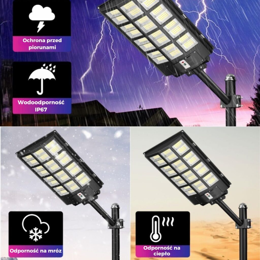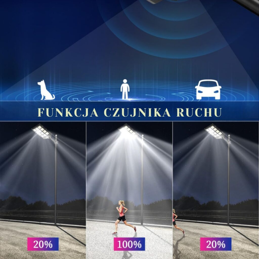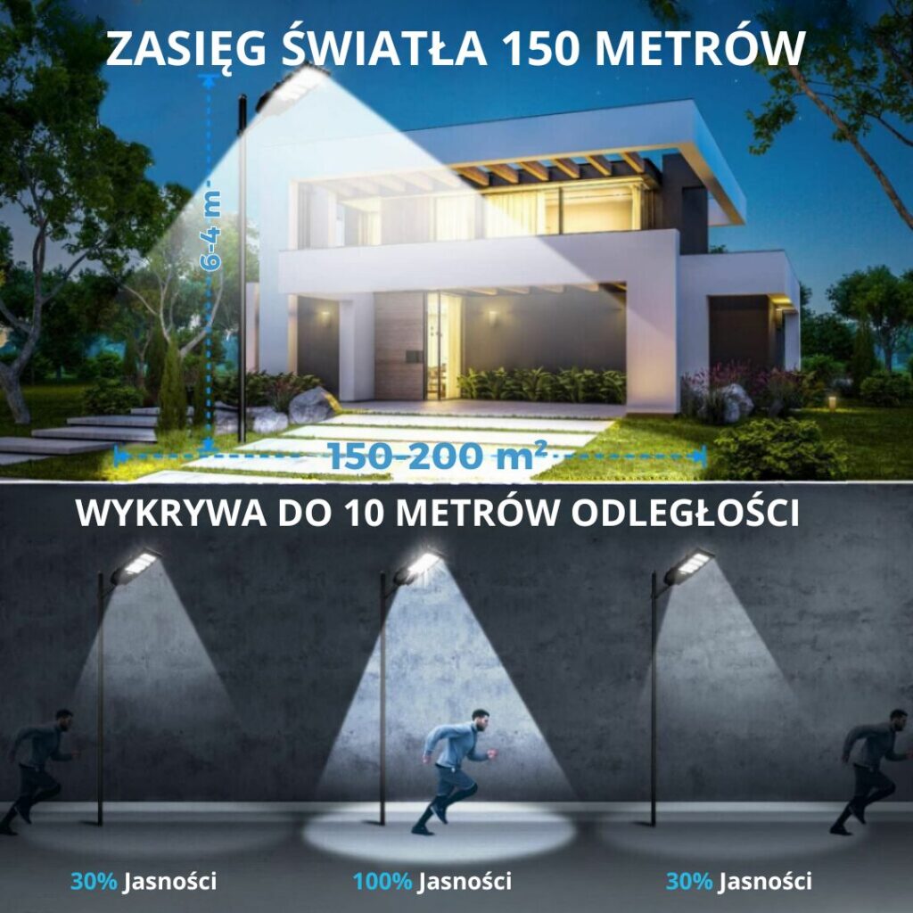 Łatwy do zainstalowania, z 3 trybami światła LED. Czujnik ruchu do 10 metrów, zasięg światła 150 metrów. 24 godziny autonomii po zaledwie 3 godzinach ładowania słonecznego. Wodoodporny, odporny na wiatr, deszcz i śnieg. Sterowany za pomocą smartfona i pilotem.