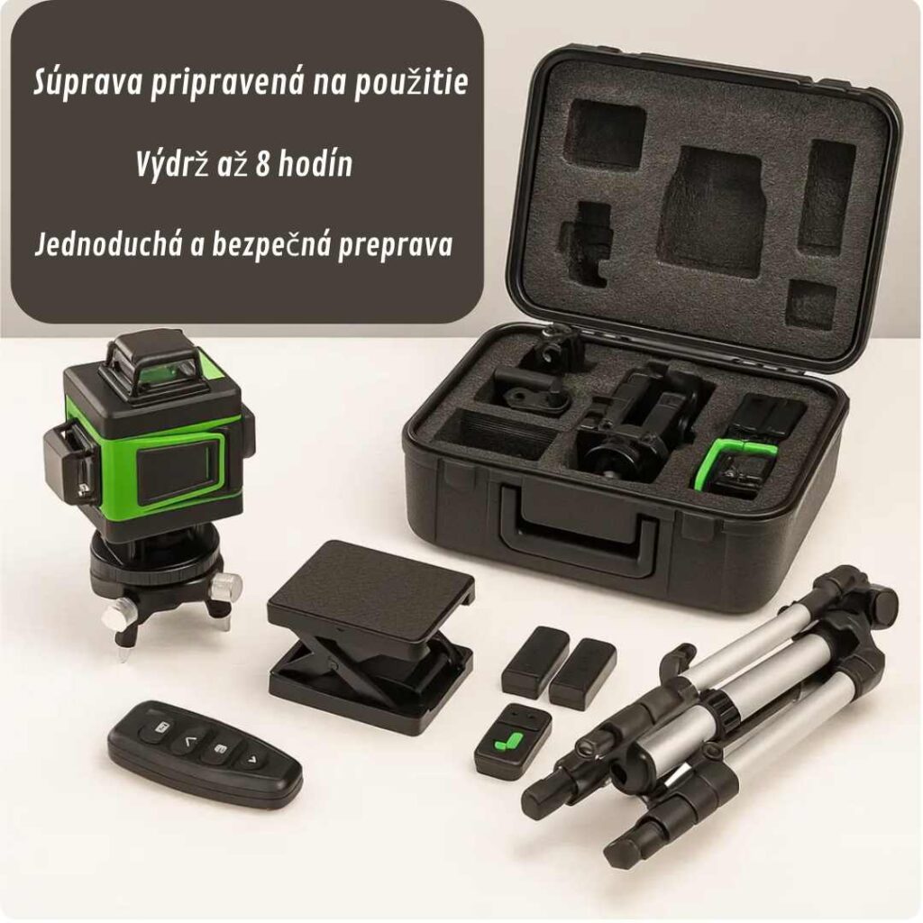 Profesionálna samonivelačná 4D laserová vodováha sa dodáva so statívom a príslušenstvom ZDARMA.