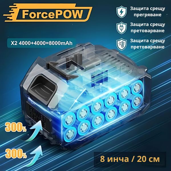 Оборудван е с две 21V батерии, които осигуряват до 8 часа непрекъсната работа, идеален за дълги, непрекъснати работни сесии.