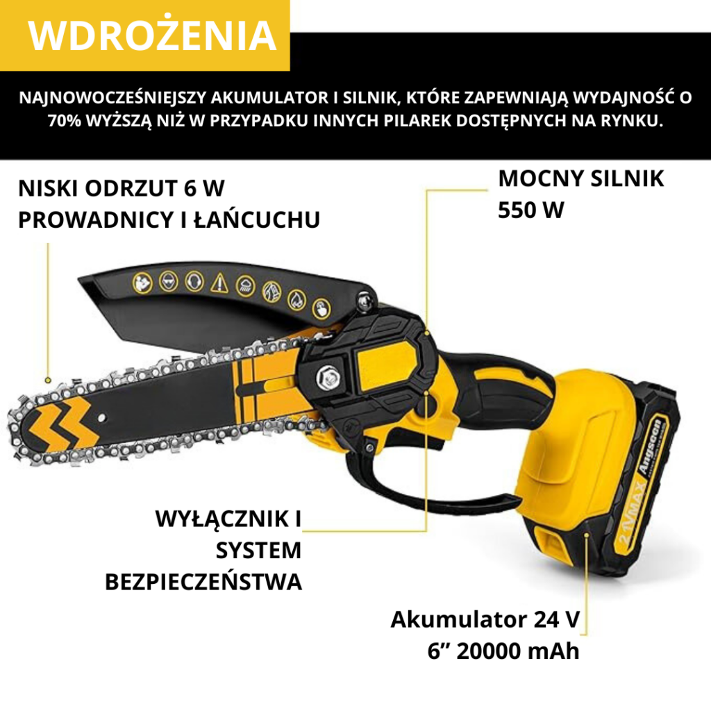 Dzięki ergonomicznemu uchwytowi i precyzyjnemu łańcuchowi można szybko i wydajnie skracać, kształtować i piłować gałęzie i drewno, co znacznie ułatwia prace ogrodowe.