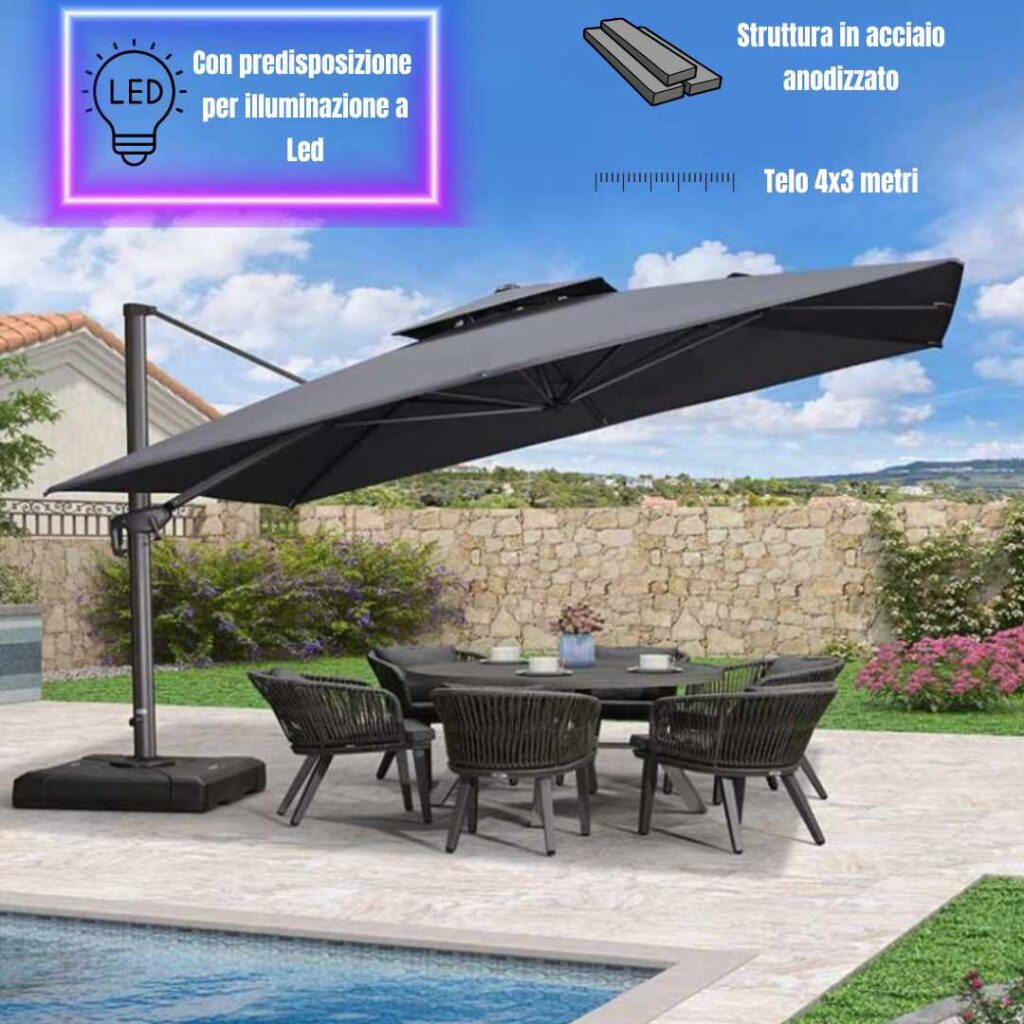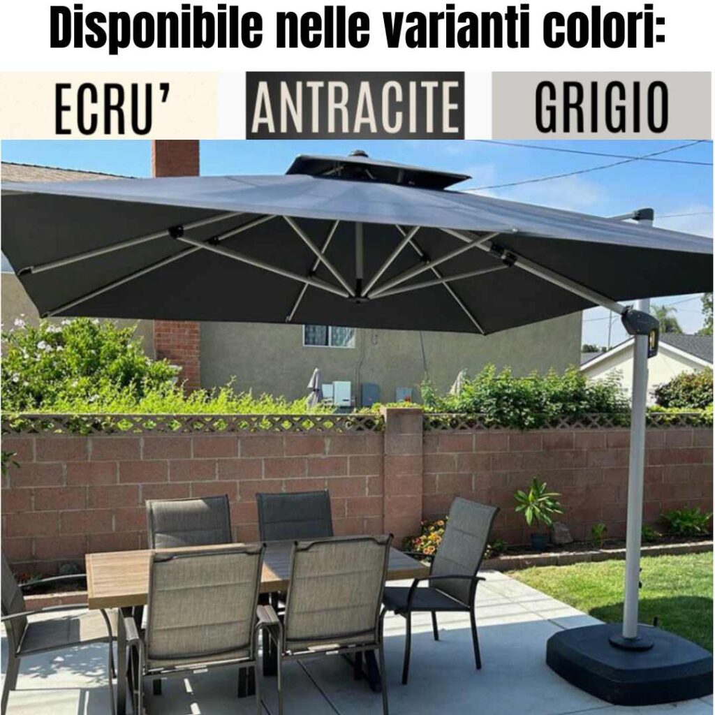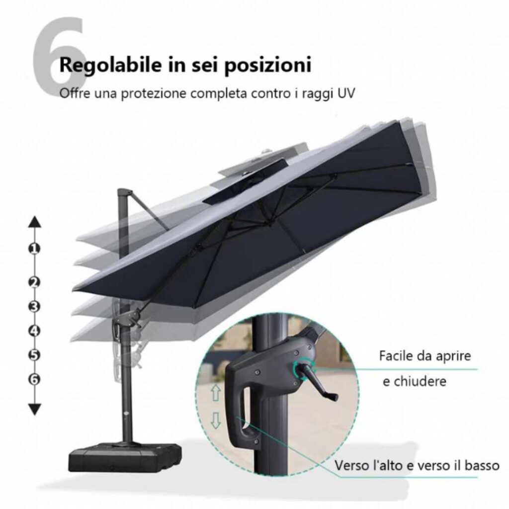 In più, puoi ruotarlo a 360° e inclinarlo come vuoi per seguire il sole durante la giornata e avere sempre l’ombra dove serve.
