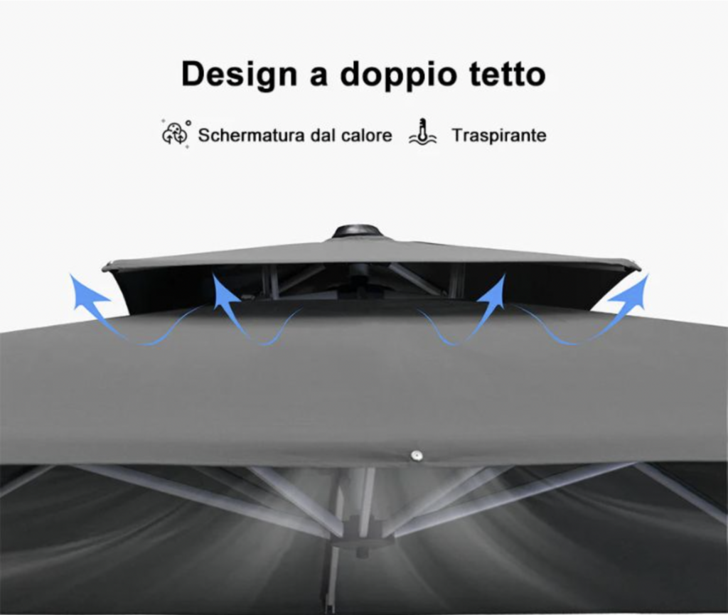 E con la finestra di ventilazione creata dal doppio tetto, l’aria circola meglio e l’ombrellone resta stabile anche quando tira vento forte per una sicurezza massima e zero pensieri.