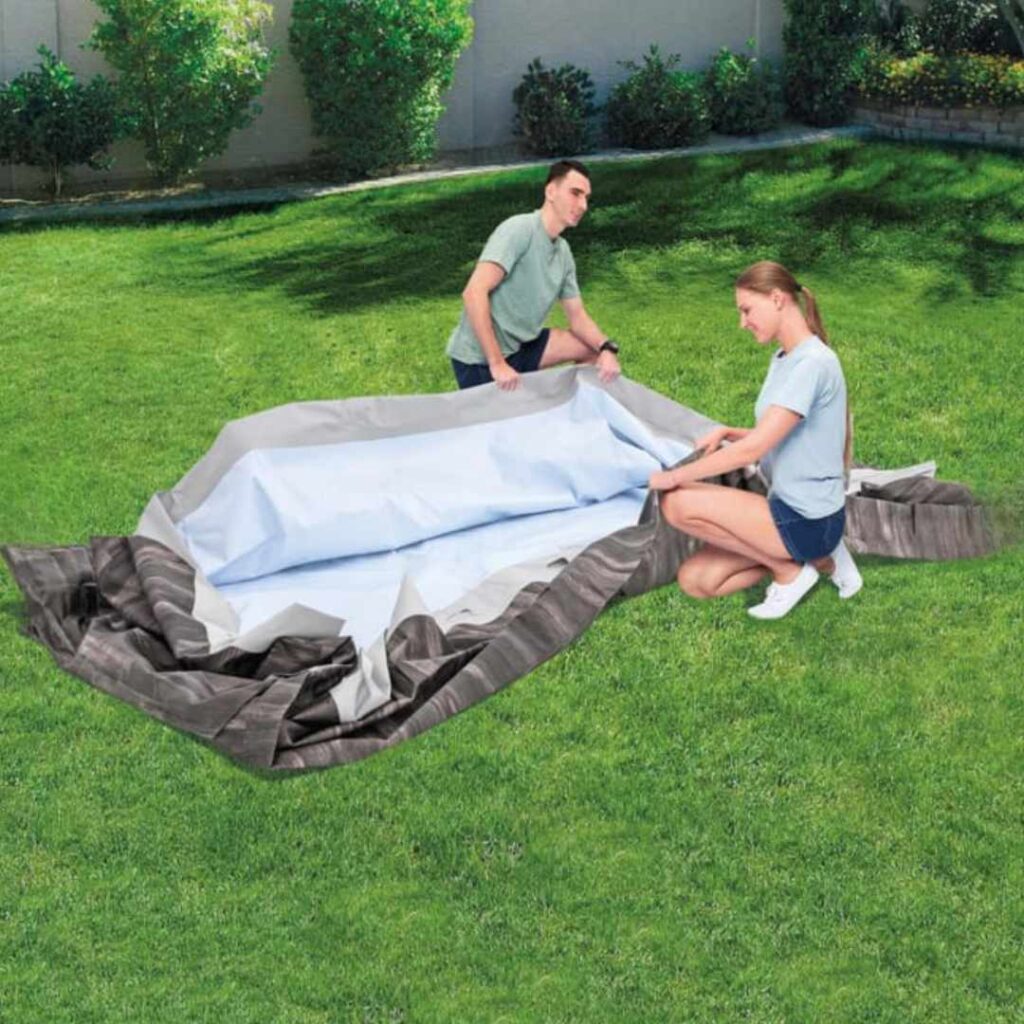 Vestavěné čerpadlo s filtrem udržuje vodu vždy čistou, zatímco kryt ji chrání před nečistotami a pomáhá udržet teplotu. Na konci sezóny lze snadno vypustit přes zahradní hadicovou přípojku.