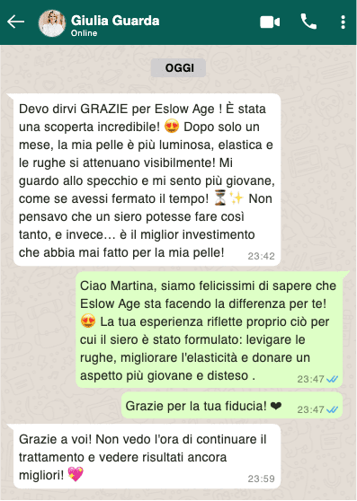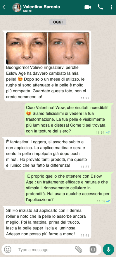 I primi risultati con Age Eslow™ si notano già dopo 7 giorni: la pelle appare più idratata, luminosa e morbida al tatto. Dopo 14 giorni, le prime rughe iniziano a distendersi e il viso risulta visibilmente più compatto. Dopo 30 giorni, il miglioramento diventa ancora più evidente: la pelle ritrova tono, elasticità e i segni del tempo si attenuano.