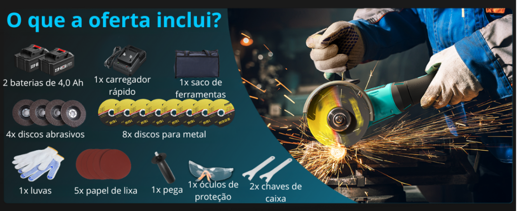 + CONJUNTO COMPLETO DE DISCOS, CARREGADOR RÁPIDO, LUVAS, ÓCULOS DE PROTECÇÃO E FERRAMENTAS NO VALOR DE