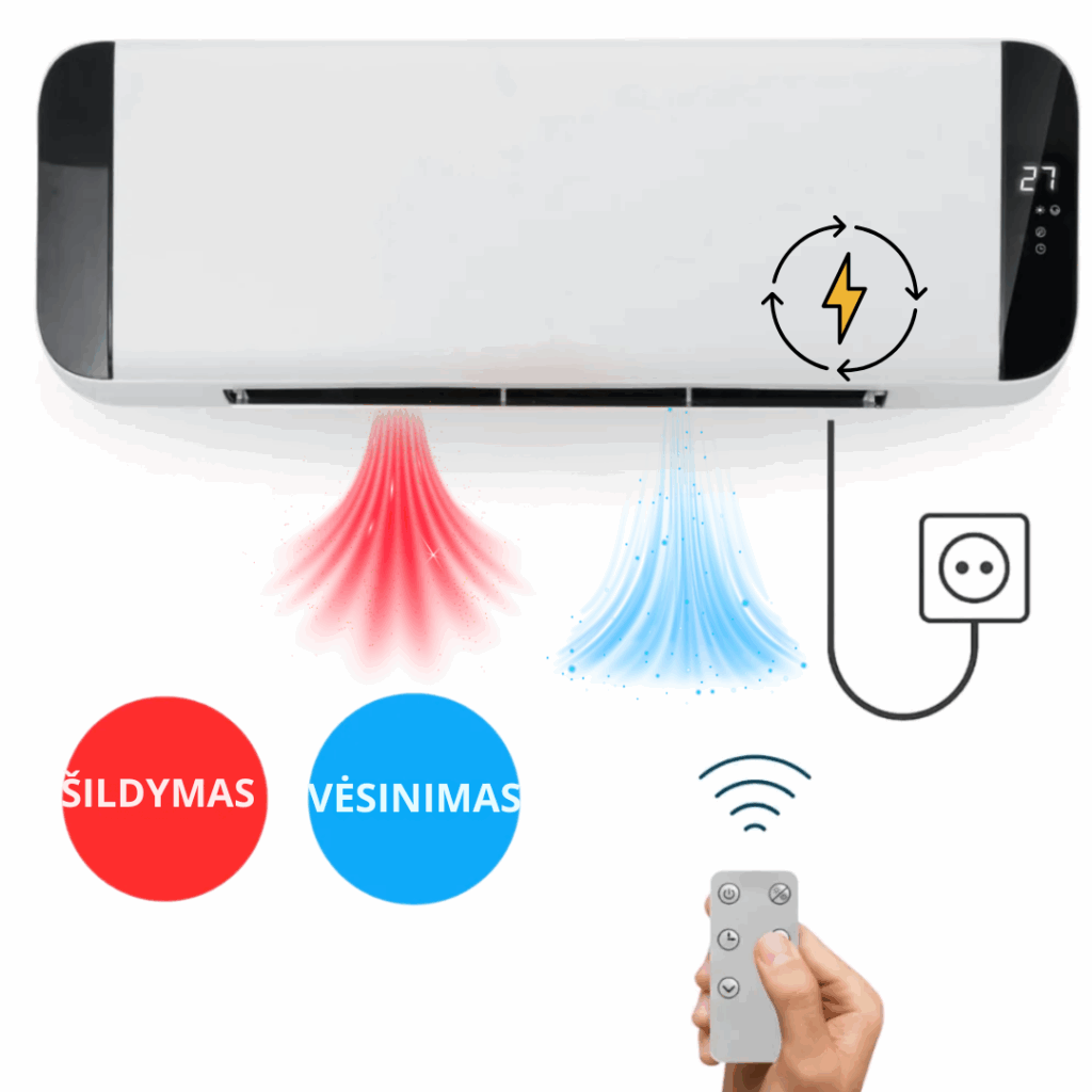 Lengvai sumontuojamas, galingas ir reguliuojamas. Greitai šildo arba vėsina patalpas iki 80 m². Vidutinės sąnaudos: apie 0,20 € per dieną